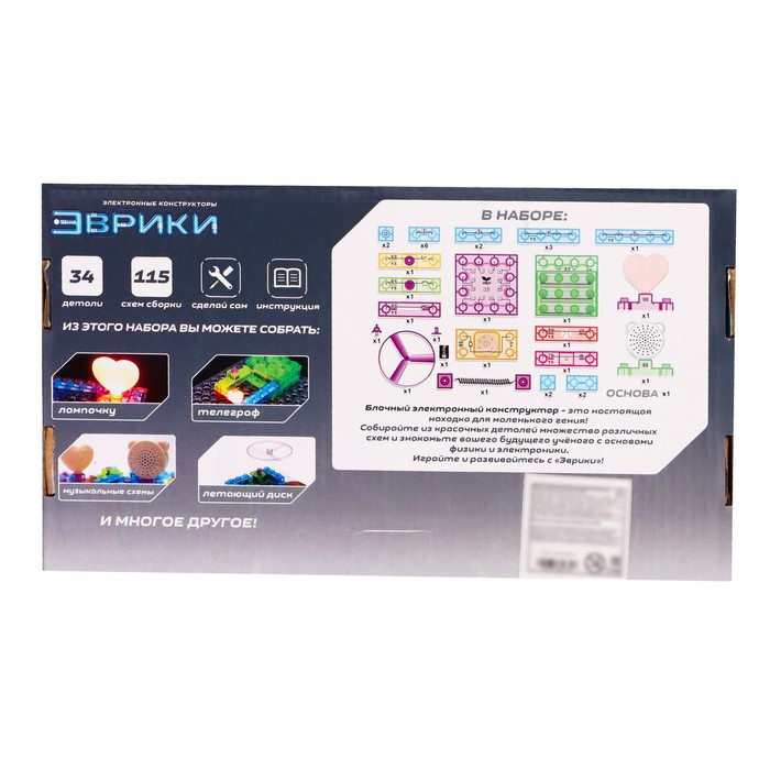 Увлекательный набор познакомит ребёнка с основами физики и электроники. Конструктор имеет множество вариантов сборки, благодаря которым юный инженер узнает о принципах работы электричества и научится самостоятельно собирать простые схемы.