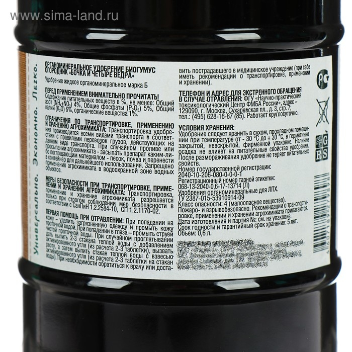 Удобрение жидкое Огородник Бочка и четыре ведра Биогумус органоминеральное 0,6л
