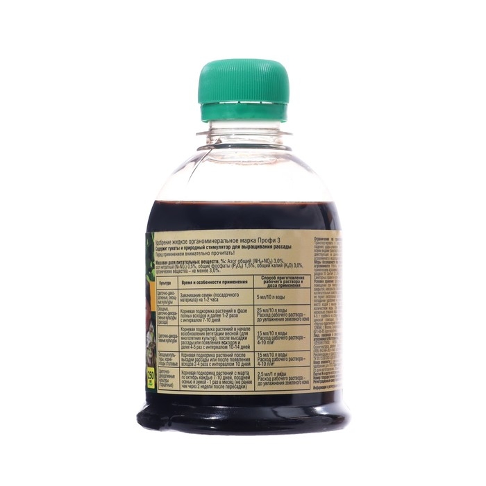 Рассада овощных и цветочных культурнорма расхода 25 мл/10 л воды. Расход раствора - до увлажнения земляного кома. Корневая подкормка после появления первого настоящего листа до высадки в грунт с интервалом 7-10 дней.