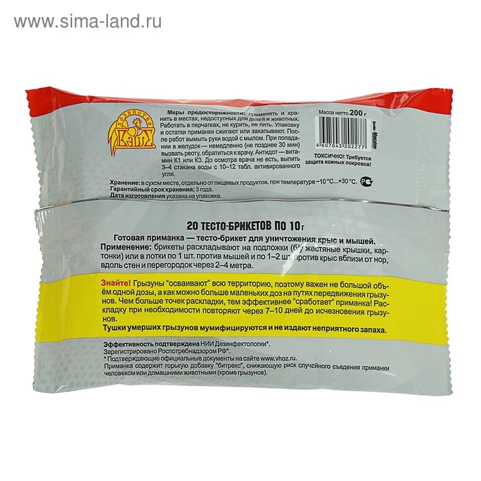 Применение: брикеты раскладывают на подложки (б/у жестяные крышки, картонки) или в лотки по 1 шт. против мышей и по 1–2 шт. против крыс вблизи от нор, вдоль стен и перегородок через 2–4 метра.