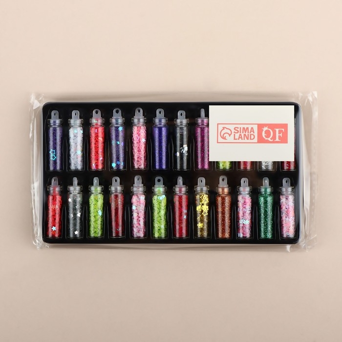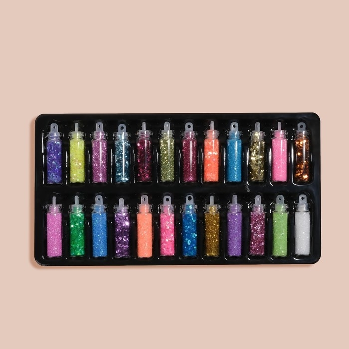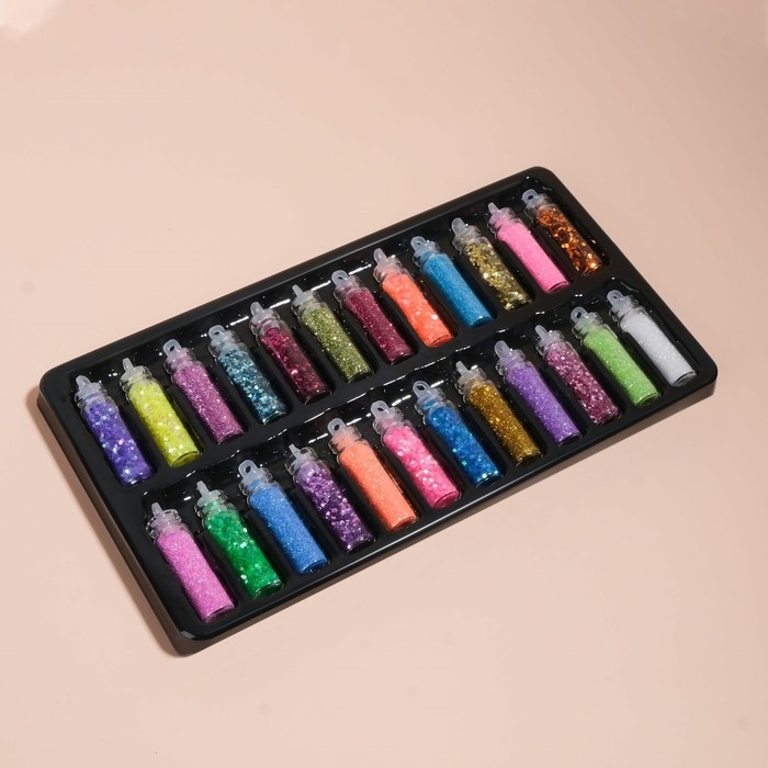 Блёстки для декора ногтей, мелкие/средние, в пластиковом органайзере, набор 24 бутылочки, разноцветные