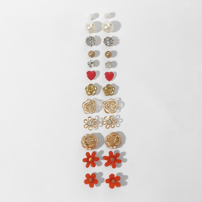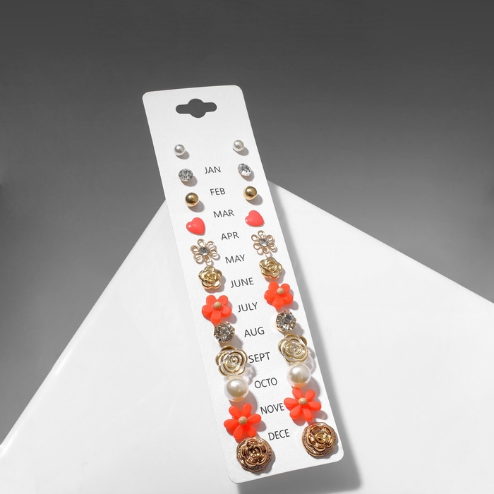 Пусеты 12 пар One year, цветочное ассорти, цвет бело-розовый в золоте