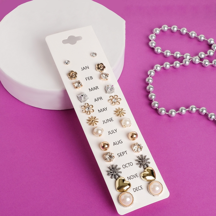 Пусеты 12 пар One year, цветочное настроение, цвет белый в золоте