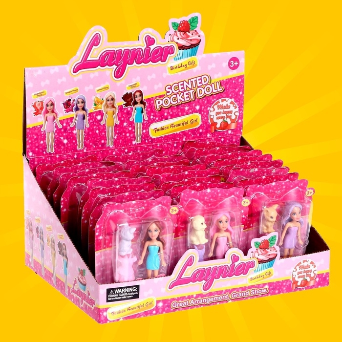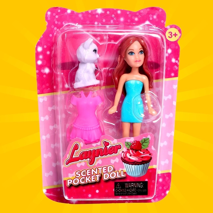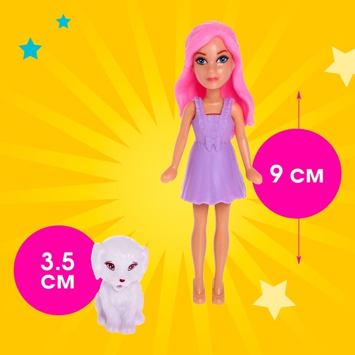 В наборе куколка, питомец и дополнительное платье. Кукла полностью выполнена из пластика, не шарнирная.