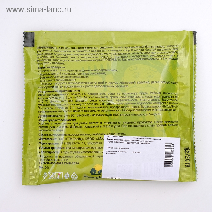 Способ применения: высыпать содержимое пакета на поверхность воды по периметру пруда. Рабочая температура биоактиватора +15 +40С. Можно начинать применение препарата, когда прогреется до +10С. Дополнительная аэрация воды повышает эффективность биоактиватора. Значительное уменьшение запахов происходит в течение 2-х недель, сине-зеленые водоросли отмирают в течение 3-х недель. В течение 3-4 недель увеличивается прозрачность воды. Биоактиватор предназначен для очистки Вашего водоема от органических, бактериологических и фито загрязнений. Флакон 200 мл рассчитан на емкость до 2000 литров и на срок до 8 недель.