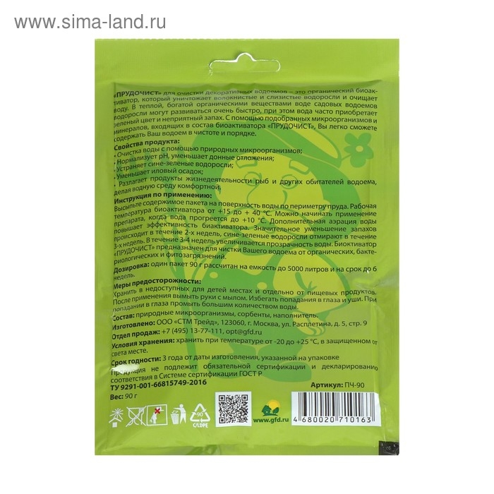 Биологическое средство для чистки декоративных прудов и фонтанов «Прудочист», 90 г.