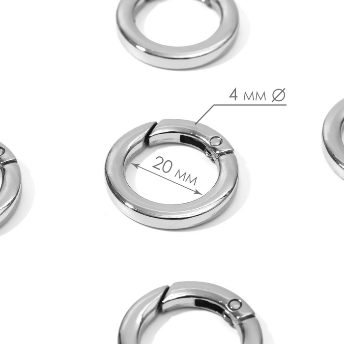 Кольцо-карабин плоский, d = 20/28 мм, толщина - 4 мм, 5 шт, цвет серебряный