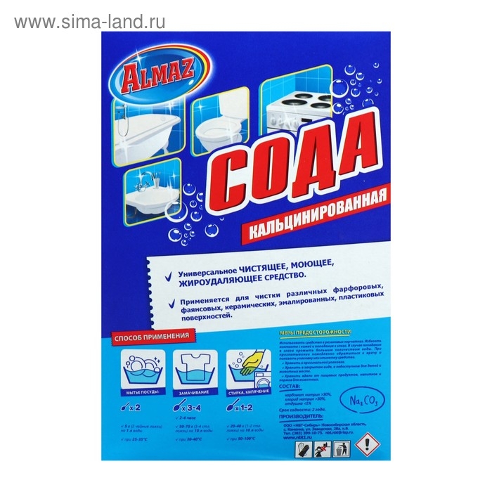 Алмаз Сода кальцинированная универсальное чистящее и моющее средство. Применяется для мытья фарфора, фаянсовой и эмалированной посуды. Эффективно удаляет загрязнения с электрической плиты, духовки, гриля, микроволновой печи, вытяжки и т.д. Незаменим для мытья раковин, душевых кабин, кафеля, ванн и унитазов, удаляя въевшуюся грязь и другие трудновыводимые загрязнения. Не содержит фосфатов, является естественной добавкой для стирального порошка, так же может полностью его заменить, смягчает воду, не раздражает кожу.