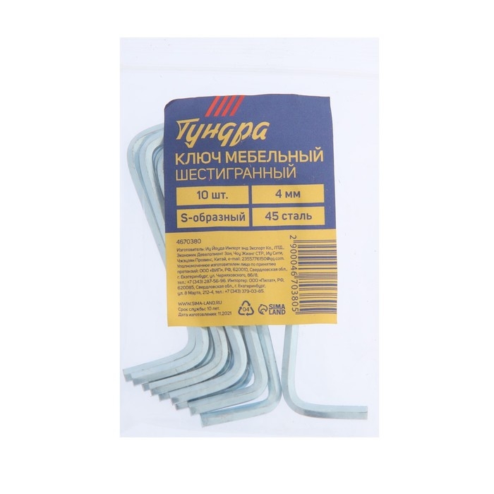 Ключ мебельный ТУНДРА, шестигранный S-образный, сталь 45, 4 мм, 10 шт.