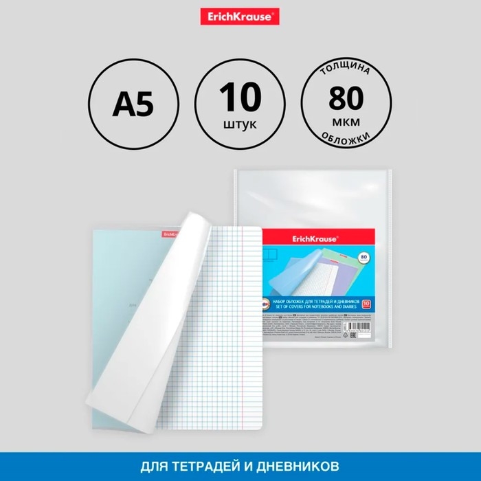 Набор обложек ПП 10 шт, 212 х 347 мм, 80 мкм, ErichKrause, Fizzy Clear, для тетрадей и дневников, с тиснением, фиксированная