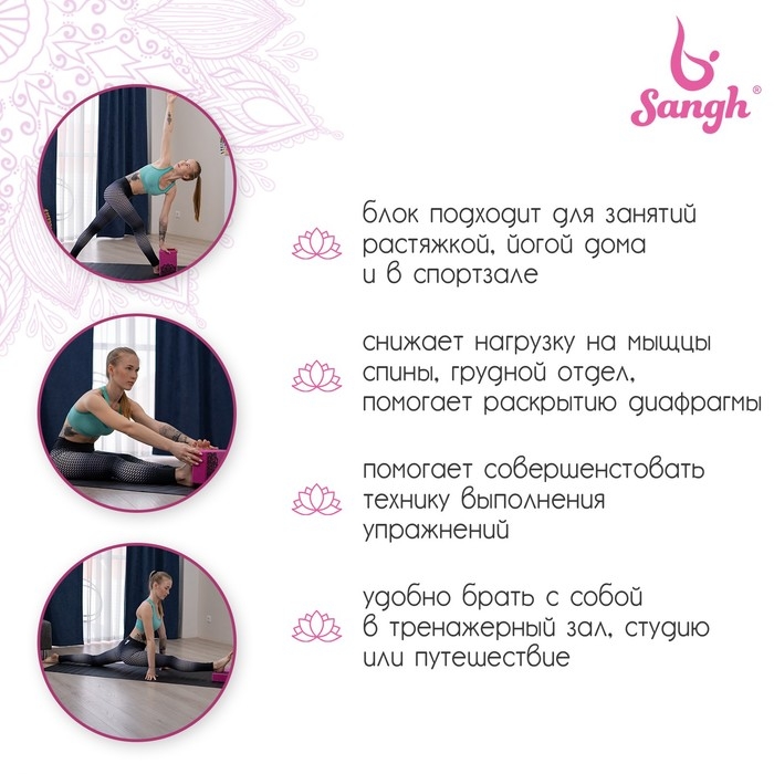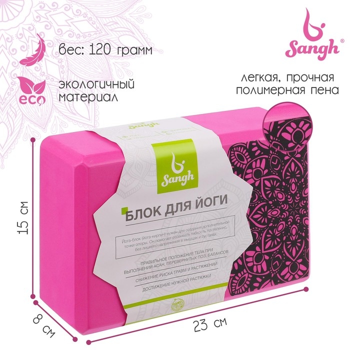 Блок для йоги Sangh, 23×15×8 см, цвет розовый