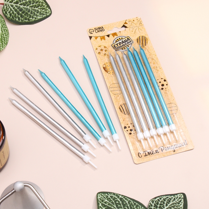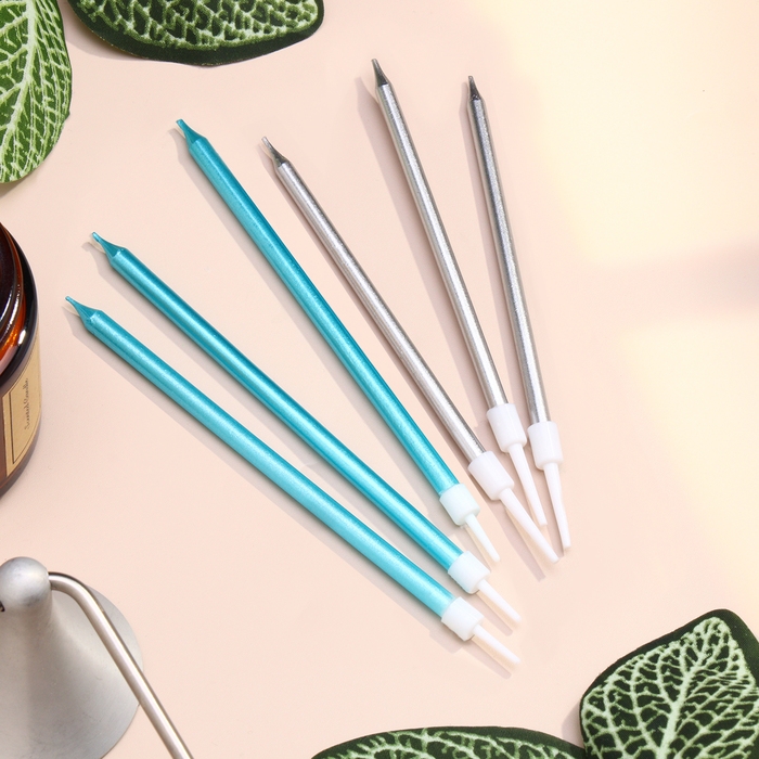 Свечи в торт "Ройс", 6 шт, высокие, 13 см, серебряные и голубые