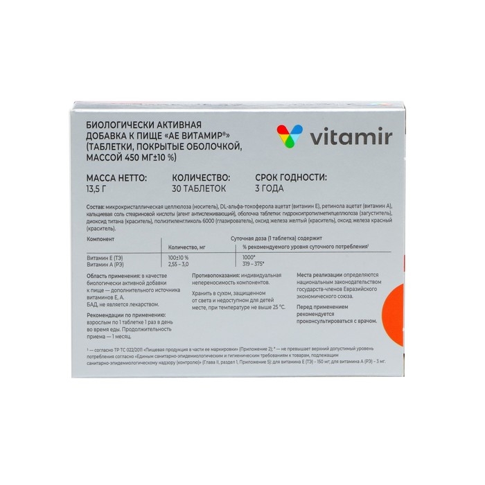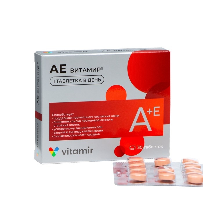 Витаминный комплекс «ВИТАМИР® АЕвитамир» — состоит из двух витаминов – А (ретинола) и Е (токоферола), которые обладают иммуностимулирующими и антиоксидантными свойствами, способствуют регенерации тканей, положительно влияют на зрение, состояние кожи, поддерживают репродуктивную функцию организма, улучшают кровообращение, восстанавливают проницаемость сосудов.
