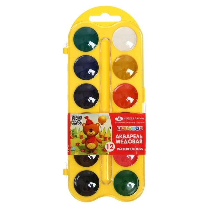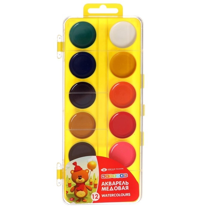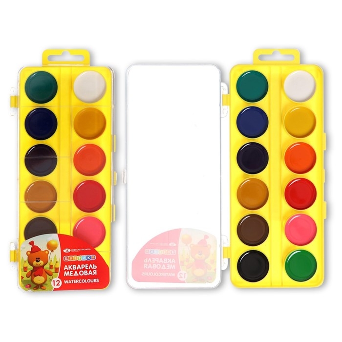 Акварель медовая ЗХК "Цветик", 12 цветов, в пластиковом пенале, без кисти