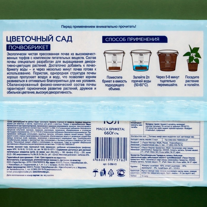 Брикет разводится в 4 л теплой воды, увеличиваясь в объеме до 10 л готового грунта. pH:5,5-6,5