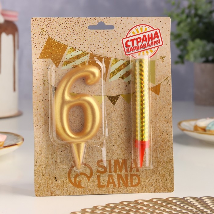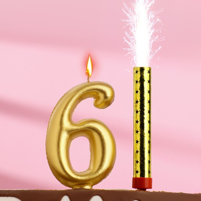Набор Свеча для торта цифра 6 Гигант, золотая, с фонтаном, 9,5 см