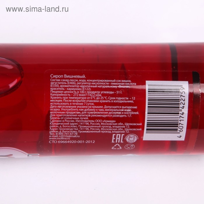 Состав: сахар-песок, вода, концентрированный сок вишни, регулятор кислотности - лимонная кислота(Е330), ароматизатор идентичный натуральному «Вишня», краситель – акванат кармин 0045, загуститель бланоза (Е466). Пищевая ценность в 100 г продукта: углеводы – 51 г. Калорийность – 272 ккал/1142,2 кДж.