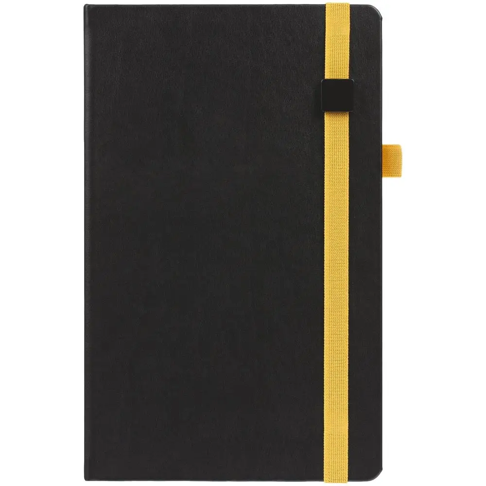Ежедневник с полутвердой обложкой, выполнен из материала Waltz, черный АА, дополнен желтой резинкой с металлическим шильдом и ляссе.