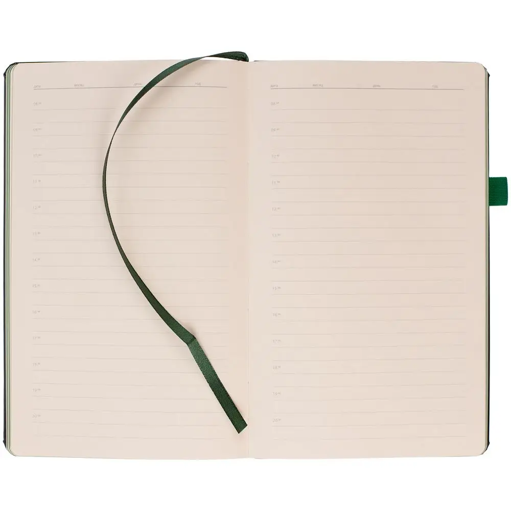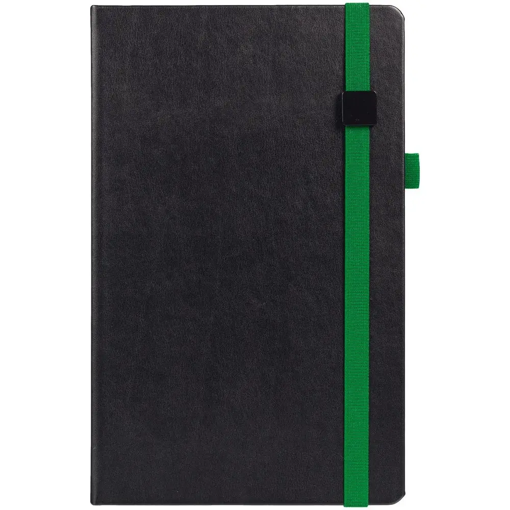 Ежедневник с полутвердой обложкой, выполнен из материала Waltz, черный АА, дополнен зеленой резинкой с металлическим шильдом и ляссе.