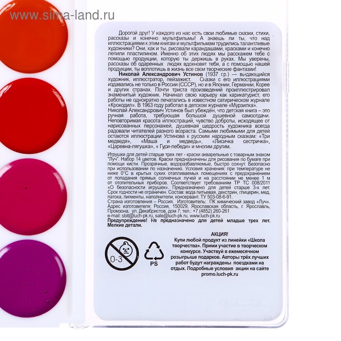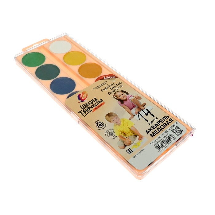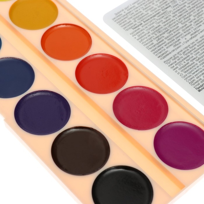 Медовая акварель изготовленная по классической рецептуре с яркими и чистыми цветами. Краска в подложке расположена группами: холодные-тёплые оттенки. Прекрасно размывается и разносится по поверхности бумаги, имея прозрачную основу без вкраплений. Краски смешиваются между собой, сохраняя насыщенность цвета. Краска легко смывается с рук и одежды.