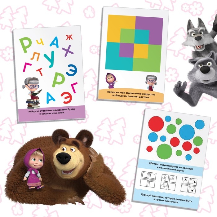 Яркие иллюстрации с любимыми героями из мультфильма «Маша и Медведь» сделают занятия веселее и интереснее.