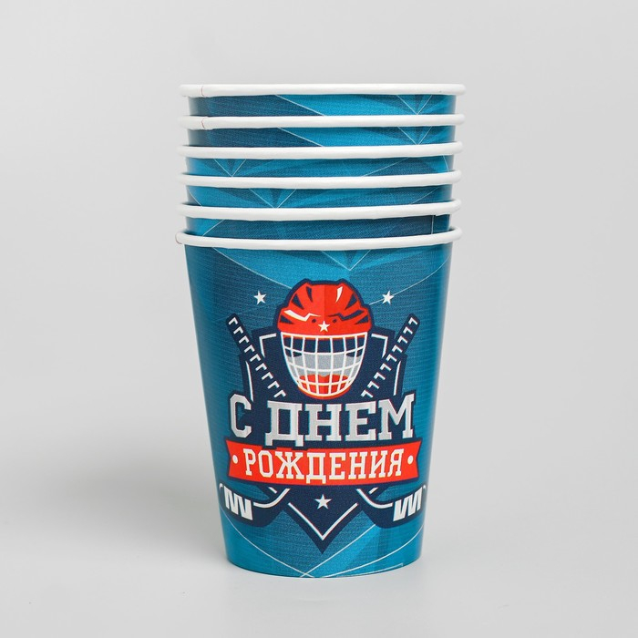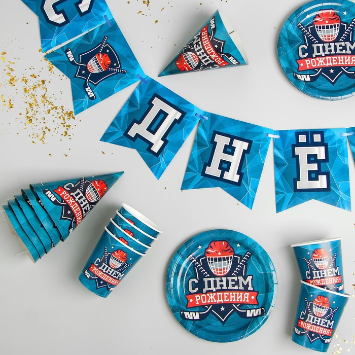 Набор бумажной посуды одноразовый С днём рождения. Хоккей», 6 тарелок, 6 стаканов, 6 колпаков, 1 гирлянда