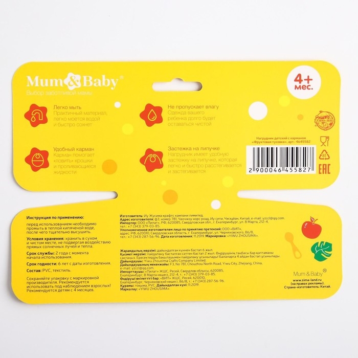 Товар изготовлен из материалов, не содержащего токсичных веществ. После использования мойте тёплой мыльной водой. Нагрудник рекомендован для детей старше 4 месяцев.