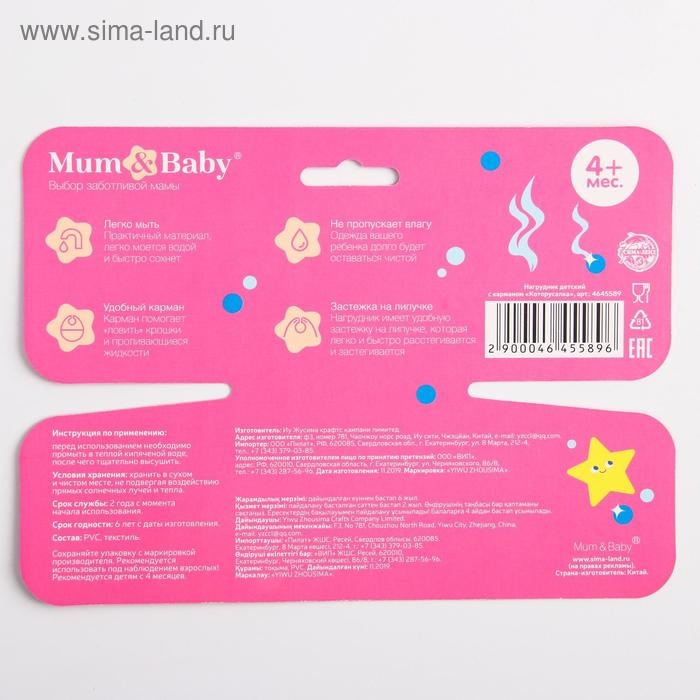 Товар изготовлен из материалов, не содержащего токсичных веществ. После использования мойте тёплой мыльной водой. Нагрудник рекомендован для детей старше 4 месяцев.