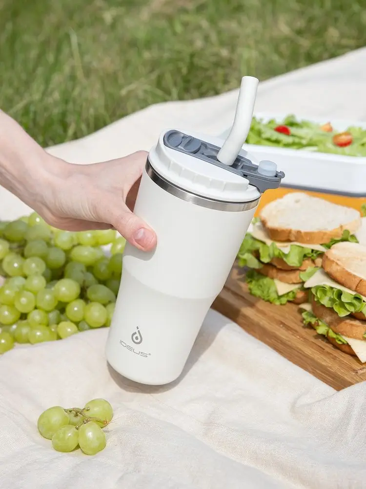 - 2 крышки в комплекте: одна на 100% герметичная с механизмом блокировки отверстия для питья, вторая — с отверстием для трубочки