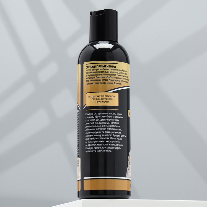 Шампунь с натуральным маслом герани и лаванды эффективно борется с блохами и клещами обладает репеллентным эффектом.