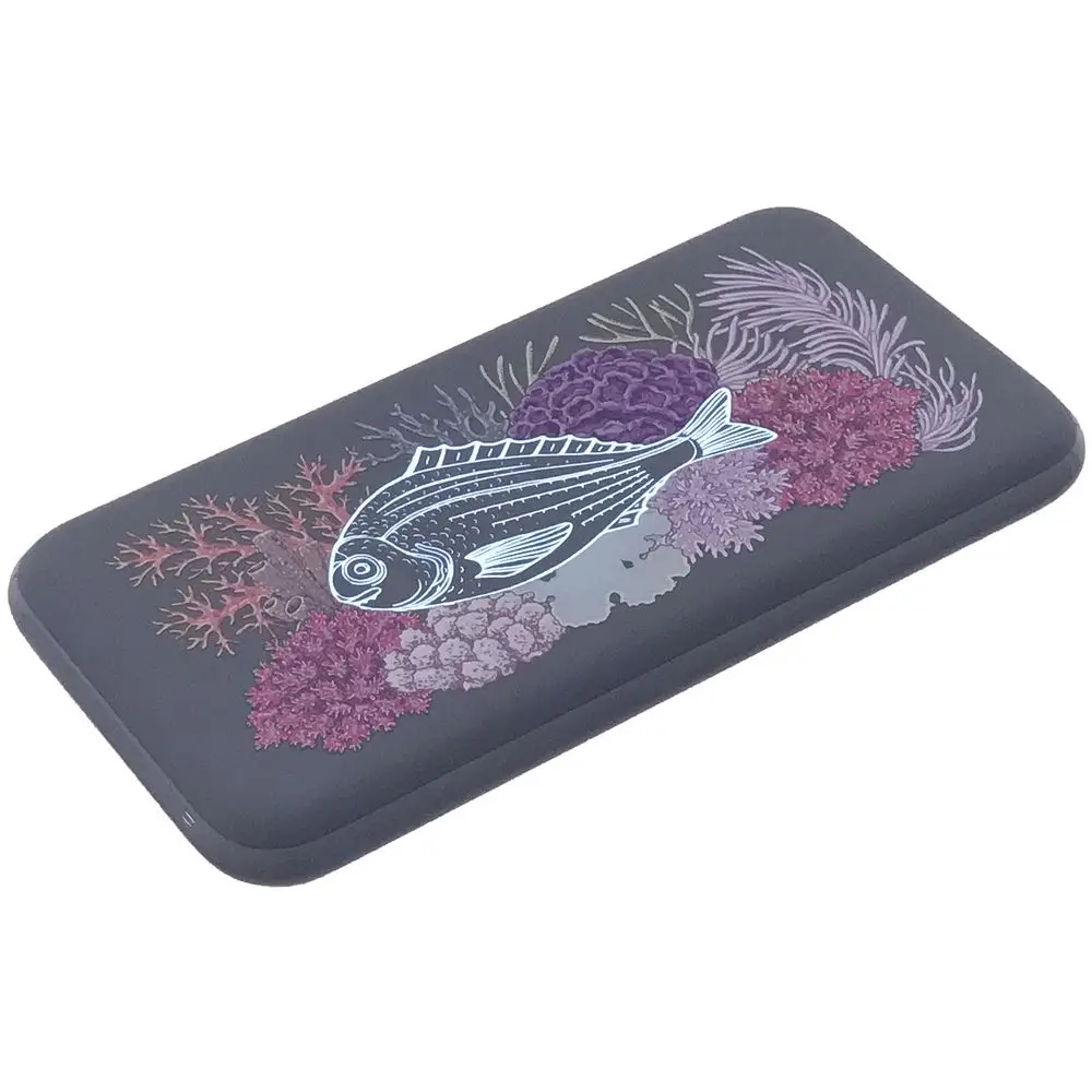 На лицевую поверхность может быть нанесено полноцветное изображение, а гравировка, хотя и будет одноцветной, дополнена равномерной белой подсветкой. 120 секунд постоянного холодно-белого свечения при начале заряда смартфона, а также при начале и окончании заряда самого аккумулятора (или при нажатии на кнопку). Для наилучшего результата рекомендуем сочетать цветные элементы УФ-печати с тонкими линиями гравировки.