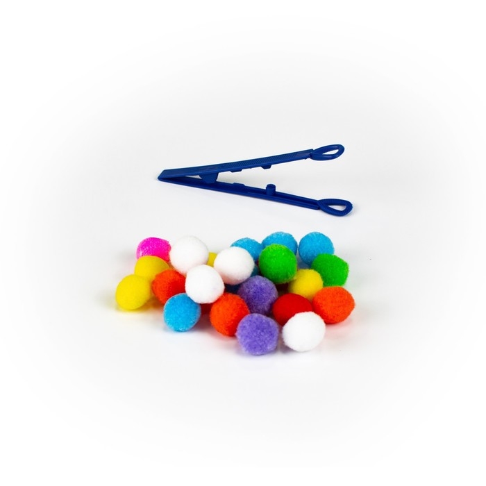В комплект входят яркие шарики-бомбошки и пинцет для сортировки.