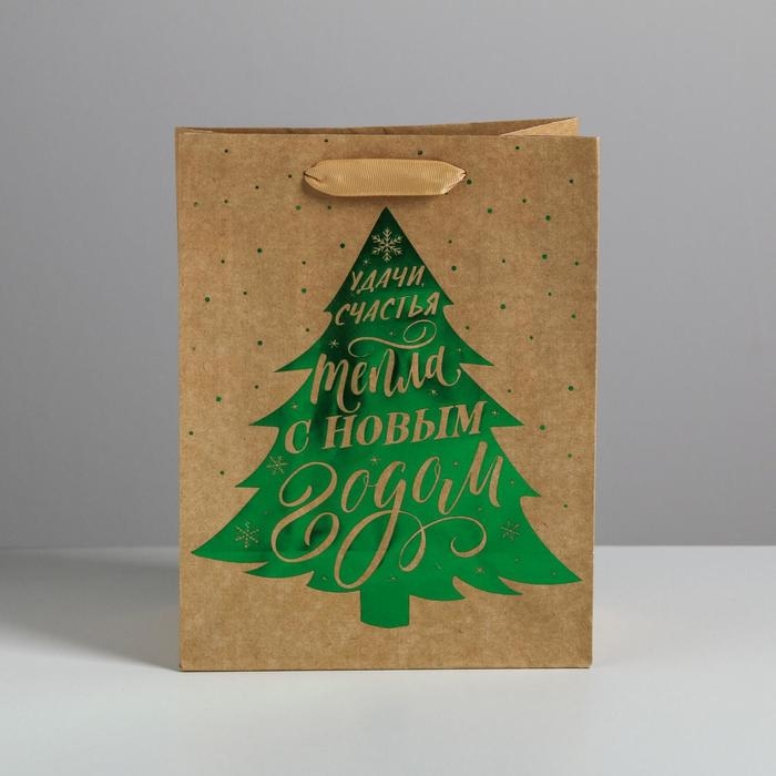 Пакет подарочный новогодний крафтовый вертикальный «Ёлочка нарядная», MS 18 х 23 х 10 см, Новый год