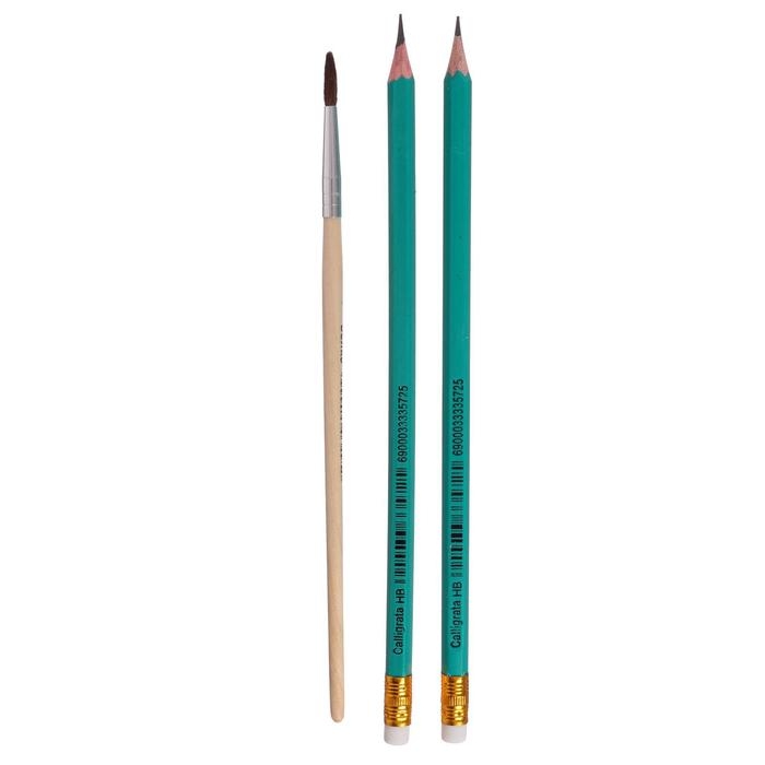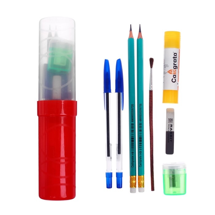 Пенал с наполнением. В комплект входят: ножницы, карандаши (2 шт.), ручки (2шт.), клей ПВА, кисть, точилка, ластик.