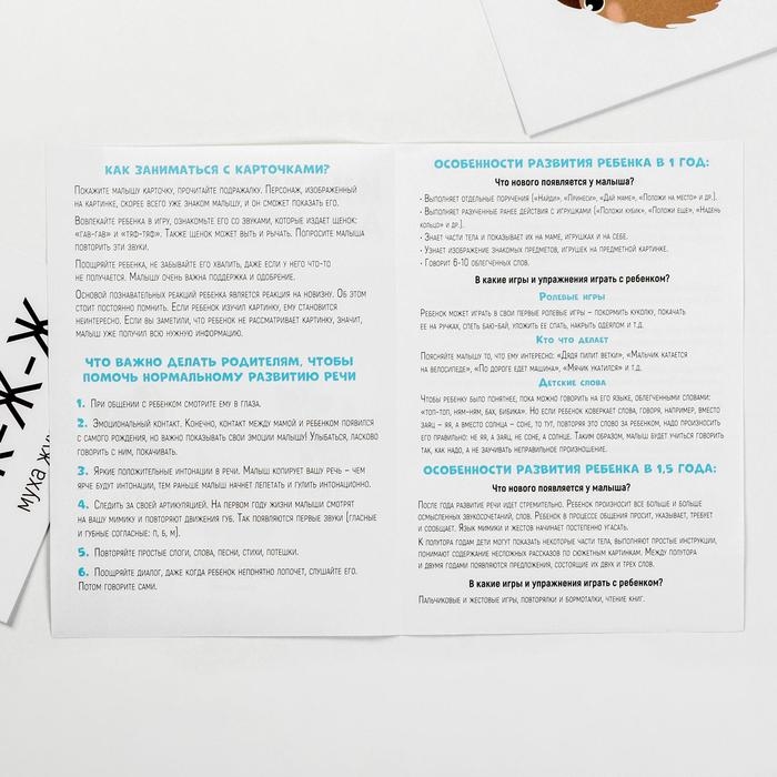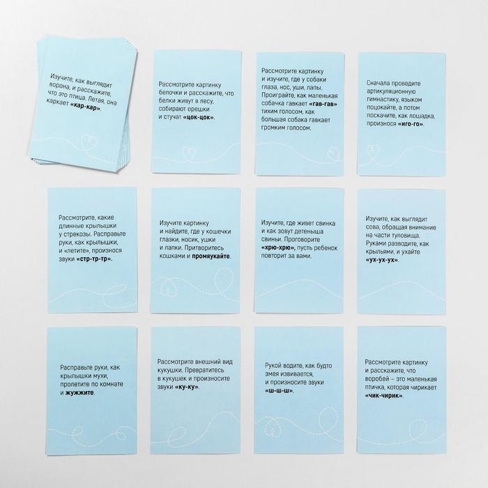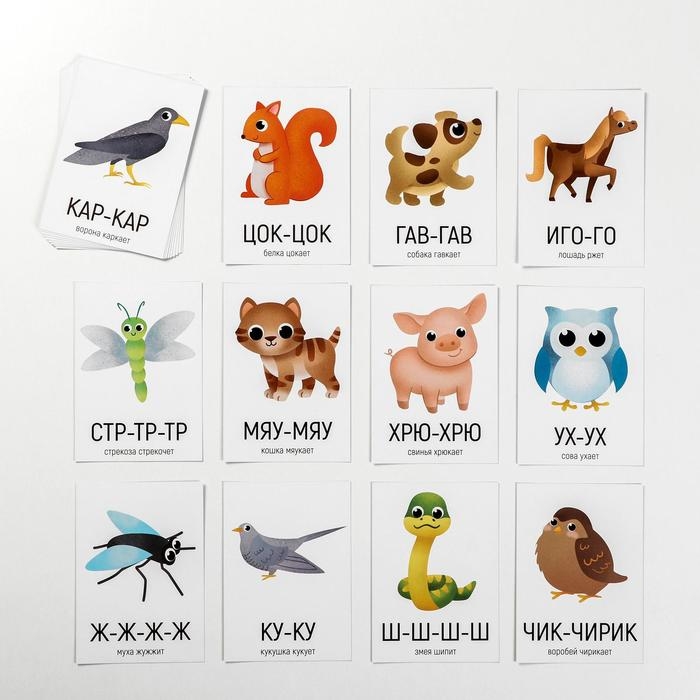 Занятия с набором обучающих карточек помогут научить ребёнка произносить сложные звуки, чувствовать ритм, а также позволят интересно провести время с родителями. Малыш узнает, какие звуки издают те или иные животные, и даже попробует повторить эти звуки сам. На одной стороне карточки нарисовано животное и звук, который он издаёт. На другой стороне — сопроводительный текст для взрослого.