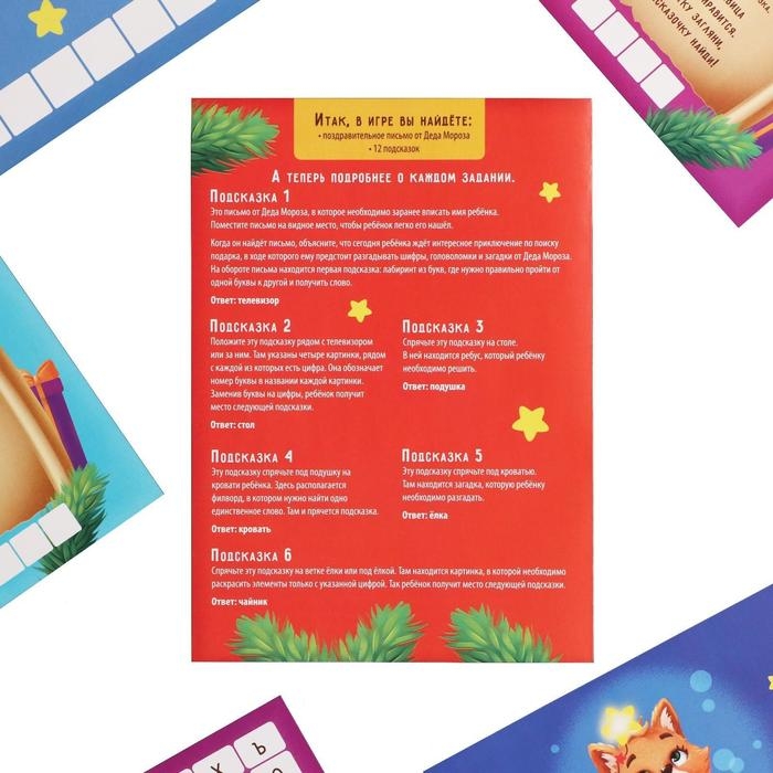 Разложите подсказки по квартире, а потом пройдите тем же маршрутом, чтобы проверить, всё ли в порядке. В комплекте также есть письмо от Деда Мороза, которое нужно поместить на самое видное место. На обороте послания находится первая подсказка.