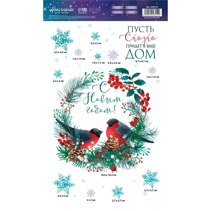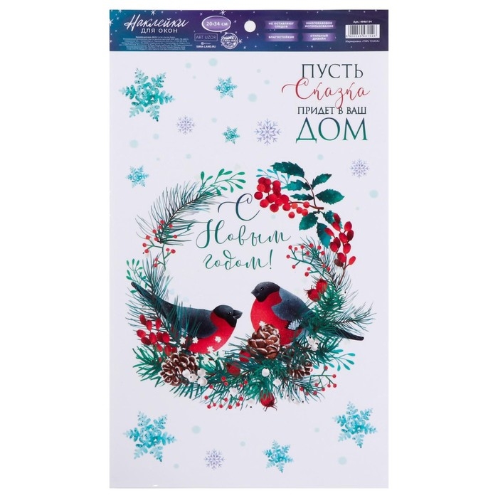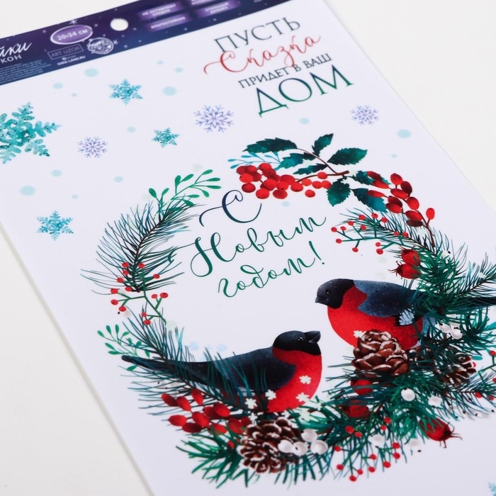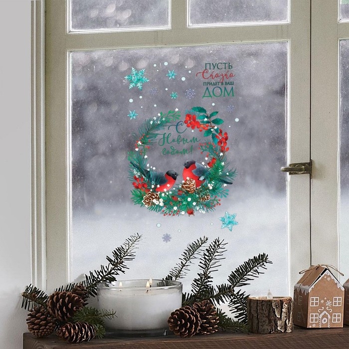 Наклейки новогодние на окна «Снегири на венке», многоразовые, 20 х 34 см, Новый год