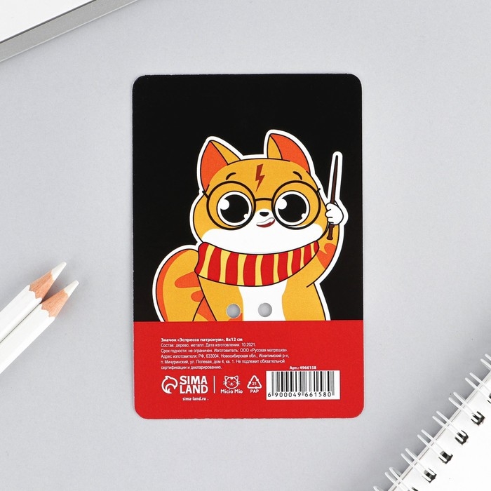 Значок "Эспрессо патронум". Удивительно мил и симпатичен. Яркий и интересный способ показать, что ты истинный поклонник Гари Потера. Значок лёгкий и долговечный, надежно и безопасно крепится к одежде, что позволяет использовать его без ограничений для всех возрастных категорий.
