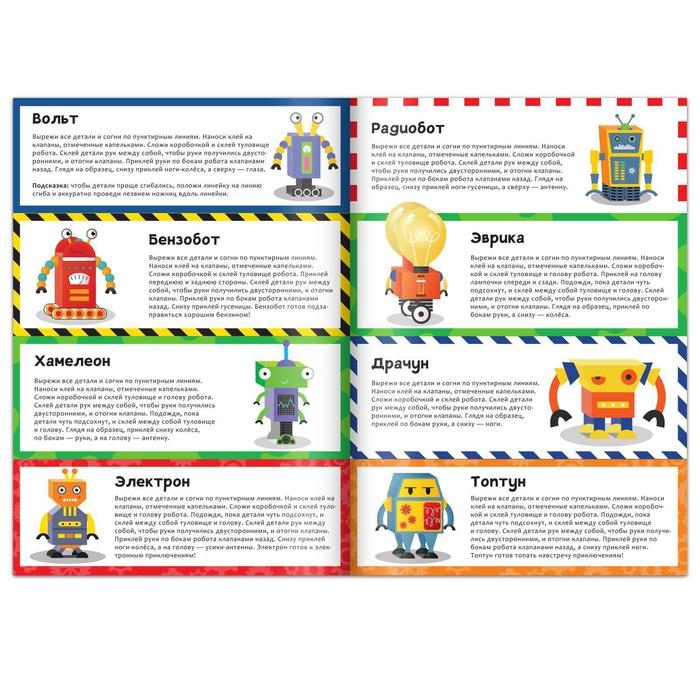В ней ребёнок найдёт целых 8 фигурок андроидов, которые нужно собрать из бумаги. Малышу предстоит вырезать детали и склеить их между собой.