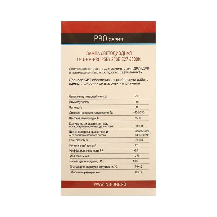 Лампа светодиодная IN HOME LED-HP-PRO, Е27, 25 Вт, 230 В, 6500 К, 2380 Лм