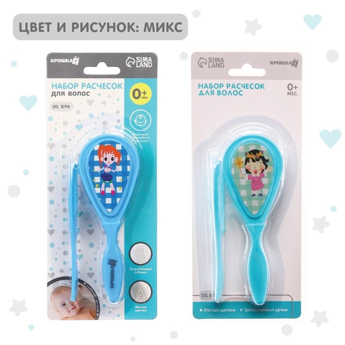 Расчёска детская + массажная щётка для волос, от 0 мес., цвет голубой, рисунок МИКС