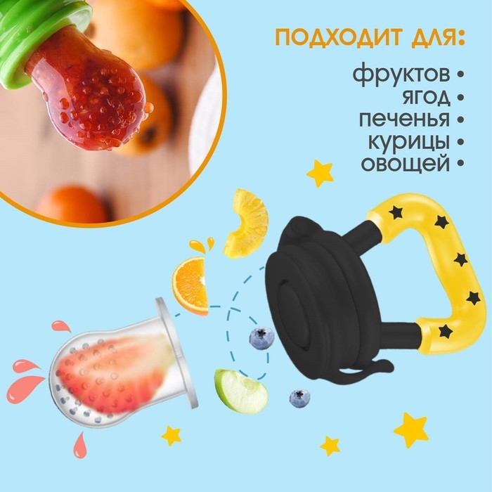 Изделие для прикорма (ниблер) пригодится в период, когда ребёнок переходит с кашки и молока на твёрдую пищу. Приспособление разовьёт у крохи жевательные навыки. Также предмет будет безопасно массировать дёсны во время прорезывания зубов.