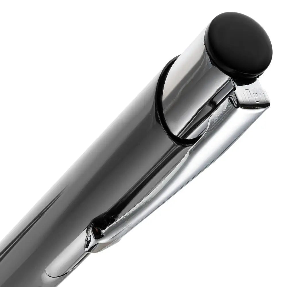 Яркая шариковая ручка с глянцевым цветным корпусом и хромированными деталями.