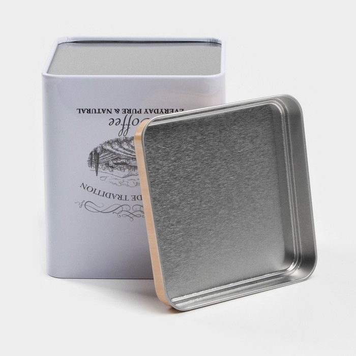 Банка для сыпучих продуктов изготовлена из жести. Крышка плотно закрывается и защищает еду от излишней влаги и проникновения посторонних запахов.