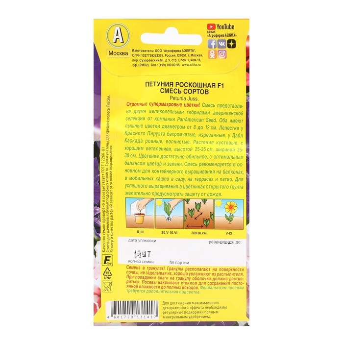 Семена Цветов Петуния Роскошная F1 крупноцветковая махровая, смесь окрасок, 10шт