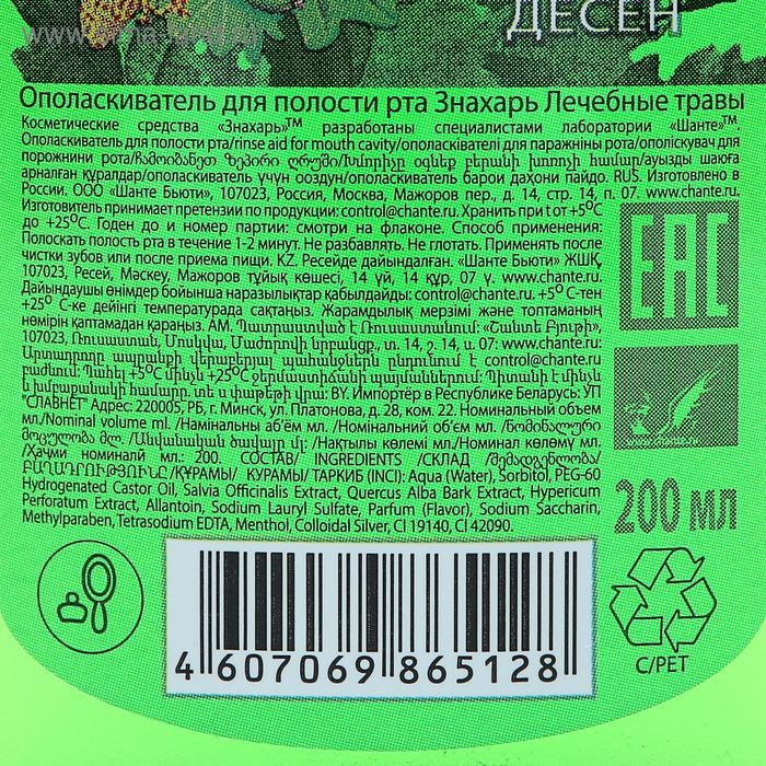 Ополаскиватель для полости рта "Знахарь", лечебные травы, 200 мл