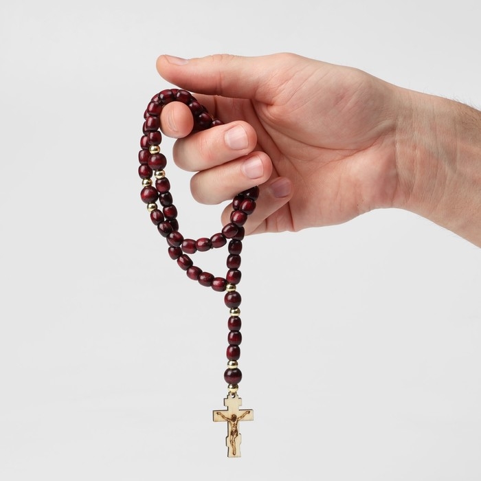 Православные чётки изготовлены из дерева, имеют 50 бусин, перемычки из пластика, подвеску-крест. Аксессуар предназначен для достижения концентрации и покоя во время медитации, также часто используется как стильное украшение на зеркало машины.