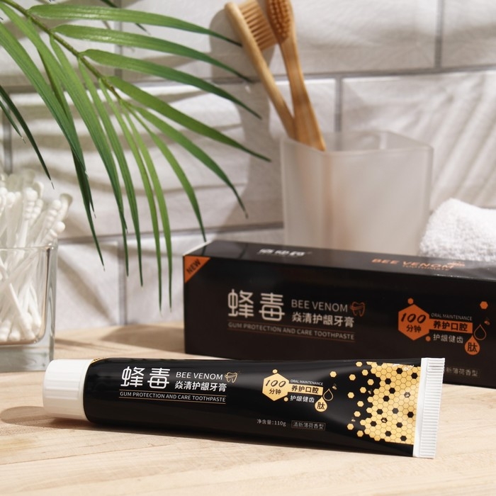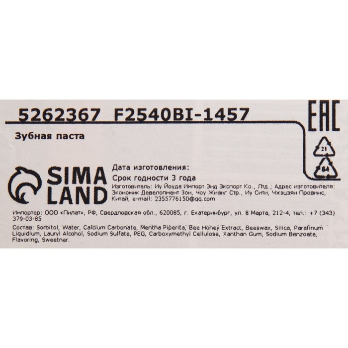 Состав: Sorbitol, Water, Calcium Carbonate, Mentha Piperita, Bee Honey Extract, Beeswax, Silica, Parafinum Liquidium, Lauryl Alcohol, Sodium Sulfate, PEG, Carboxymethyl Cellulose, Xanthan Gum, Sodium Benzoate, Flavoring, Sweetner.