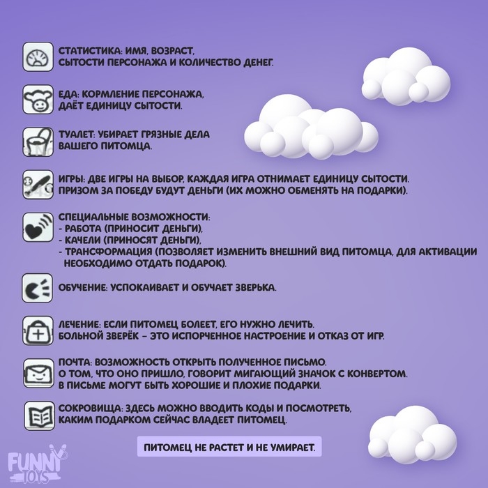 Она работает по принципу тамагочи. Нужно выбрать одного из животных, и персонаж появится на экране. У каждого из них свой характер и потребности. Если хозяин хорошо заботится о питомце, он будет постепенно расти.