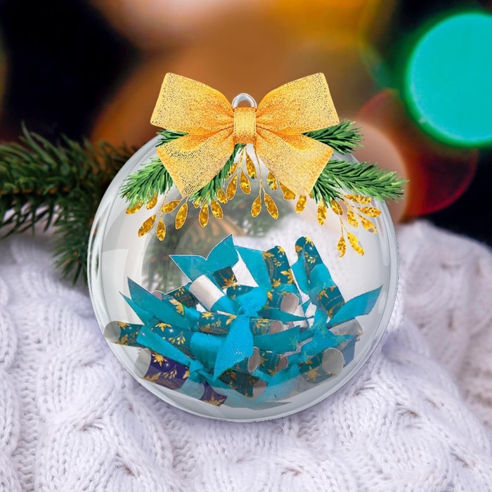 Напишите ваши заветные мечты/пожелания на бланках из набора, заверните каждое в трубочку и перевяжите ленточкой. Поместите полученные свитки внутрь половинки шара и закройте второй половиной.
